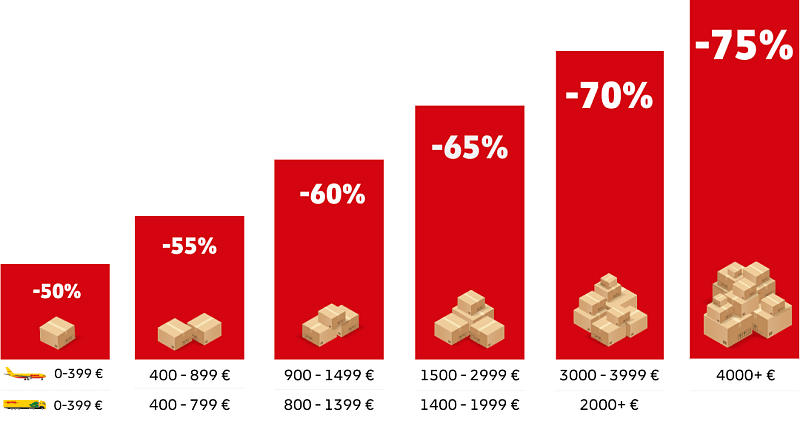 Sinu ettevõte saab seejärel allahindlust vastavalt Sinu igakuisele saatmiskulule nii, et kui vähendate saatmismahu suurust, siis väheneb ka allahindluse protsent. Saadate rohkem ja allahindlus suureneb kuni 75%-ni!